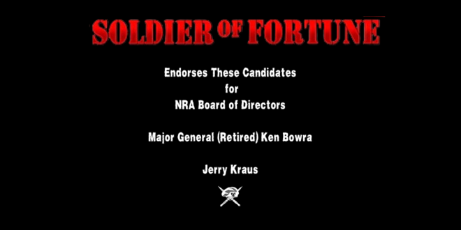 These endorsements are about who can lead the fight now. They are not meant to be taken that I do not support other candidates; I hope to get to know them, also. For now, Soldier of Fortune proudly supports Ken Bowra and Jerry Kraus. Because the Second Amendment, the NRA members, and the NRA deserve leaders who will do the right thing.
