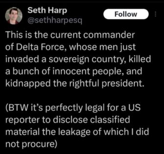 “This is the current commander of Delta Force, whose men just invaded a sovereign country, killed a bunch of innocent people, and kidnapped the rightful president.”